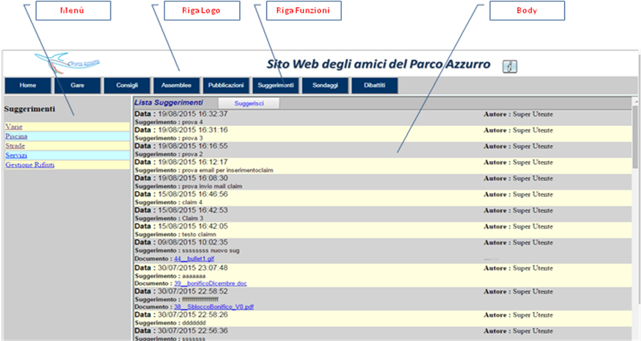 Selezionata la voce di menù, nell'area Body viene presentata la lista di tutti i suggerimenti inoltrati per la specifica categoria ordinati per data decrescente.